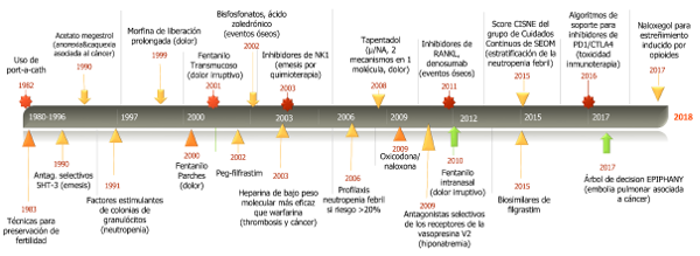 A continuación, se muestra un resumen de algunos de los principales hitos de las últimas décadas, en el desarrollo de estrategias terapéuticas de soporte en cáncer:
