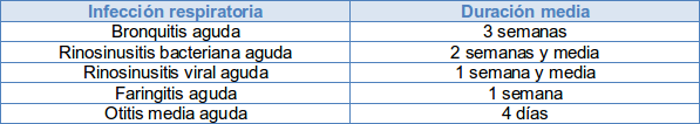 La posología y duración de tratamiento recomendada en las fichas técnicas y en los prospectos de los medicamentos "se establecen en base a resultados de ensayos clínicos que aportan evidencia sobre la dosis y periodo de tiempo necesarios para erradicar infecciones por bacterias. La falta de una adhesión completa al tratamiento antibiótico puede desencadenar la aparición de resistencias que hacen que el antibiótico deje de ser eficaz en el tratamiento". Así, la experta de IMQ ha recordado las duraciones medias de los síntomas de algunas infecciones respiratorias para adecuar las expectativas de los pacientes al desarrollo real de la enfermedad: