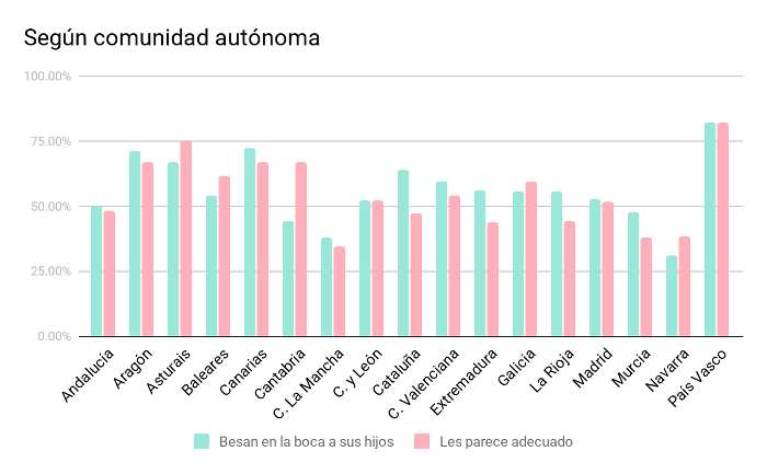 Aunque en casi todo el territorio las diferencias son sutiles, los resultados de algunas comunidades autónomas destacan sobre el resto. Así, Euskadi se convierte en la comunidad donde los padres besan más a sus hijos en la boca, por delante de Canarias y Aragón. En el lado opuesto de la tabla, Navarra se sitúa como la comunidad en la que menos se hace, seguida por Castilla La Mancha y Cantabria. A pesar de ello, es Castilla La Mancha la comunidad en la que este gesto tiene menor aprobación.