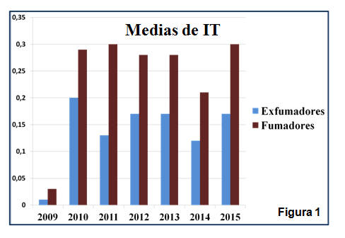 En la siguiente figura se puede ver como las medias de Incapacidades Laborales para cada año son siempre superiores en los fumadores que en los ex fumadores.