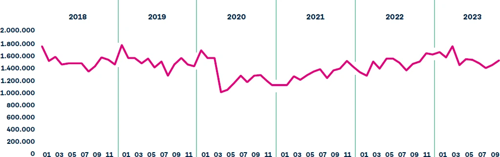 Tras la relajación de estas restricciones, vuelve a aparecer a partir del otoño de 2021 un patrón similar al prepandémico, aunque sin alcanzar hasta la fecha los mismos niveles de demanda (Figura 1). Este comportamiento se observa a nivel nacional y se replica en la mayoría de las comunidades.