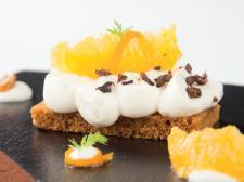 Tostada de pan de especias con crema de queso, nibs de cacao y naranja