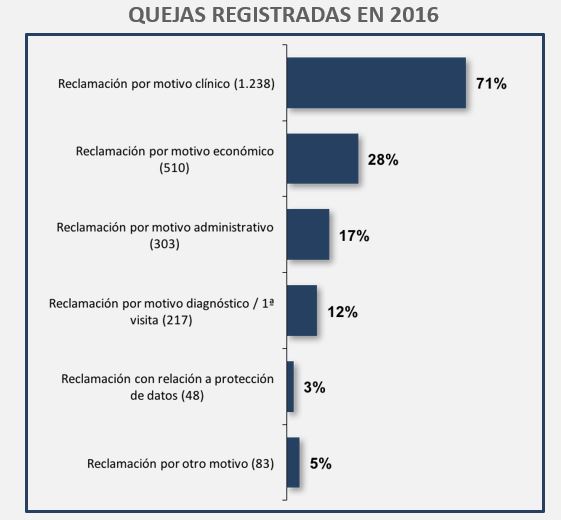 Durante el año 2016, se han recibido un total de 1.821 reclamaciones: 808 de clínicas privadas; 899 de clínicas corporativas; 93 de aseguradoras y 21 de otros centros no incluidos en la clasificación anterior. El número total de quejas/reclamaciones ha pasado de 1.659 en 2015 a 1.821 en 2016, lo que supone un incremento del 9.8%.