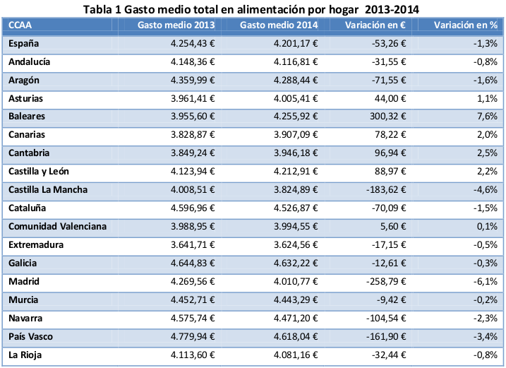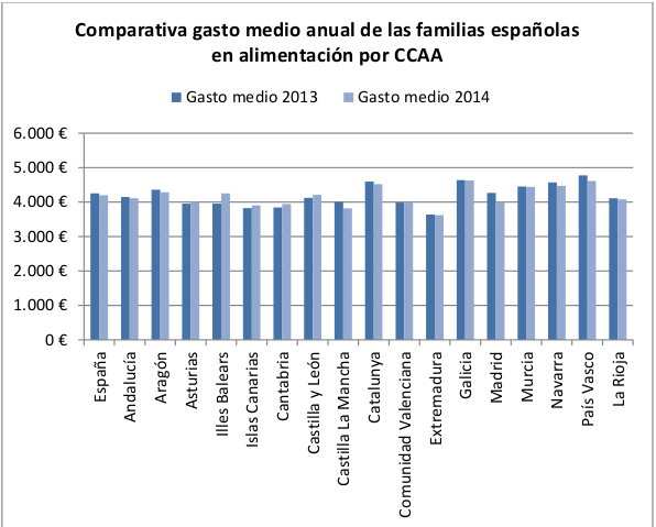 Este descenso varía considerablemente por comunidad autónoma y son las familias de Madrid, Castilla la Mancha y País Vasco las que más han reducido su gasto medio en alimentación, entre 150€ y 250€ anuales menos que en 2013, un 4,7% menos. La tendencia es inversa en otras comunidades como Baleares, que han gastado un 7,6 % más (300€/año);  Cantabria, cuya inversión ha sido un 2,5 % más alta que en 2013 (95€) y  Castilla y León, con un 2,2 % de crecimiento en su gasto medio (90€).