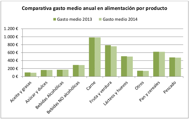 Considerando los tipos de producto, casi una cuarta parte del presupuesto se va en carne. Aunque el gasto medio en esta partida se ha reducido ligeramente en el último año, sigue rondando los 1.000€. Frutas y hortalizas es el segundo tipo de alimento en el que se destina más dinero (760€), un 3,4 % menos que en 2013. También el pan y los cereales son parte importante del presupuesto de alimentación de las familias españolas, que dedicaron a su compra unos 620€ durante 2014. Muy lejos de estas cifras están productos como el aceite, los dulces y el alcohol, en los que los hogares invirtieron menos de 200€ en el conjunto del año.