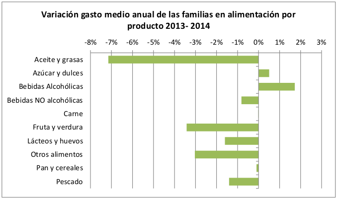 Analizando la variación del gasto en términos absolutos, la reducción del presupuesto no es muy acentuada (-1,3%). El producto más afectado en 2014 ha sido el aceite y otras grasas en los que los españoles han gastado un 7% menos que el año anterior. Le siguen las frutas y verduras con un descenso del 3,4%.