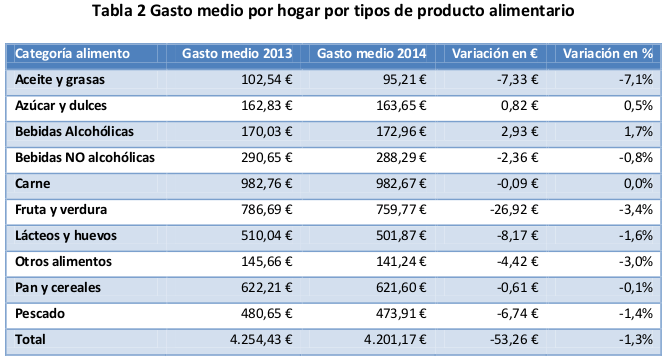 El gasto de las familias españolas en alimentación (incluidas las bebidas) continuó su tendencia a la baja en 2014, si bien de manera algo más moderada que en años anteriores, según un estudio realizado por AIS Group.  Así, entre 2013 y 2014 el descenso se situó en un 1,3%, unos 50€ al año menos por hogar, hasta quedarse en los aproximadamente 4.200€ anuales de media.