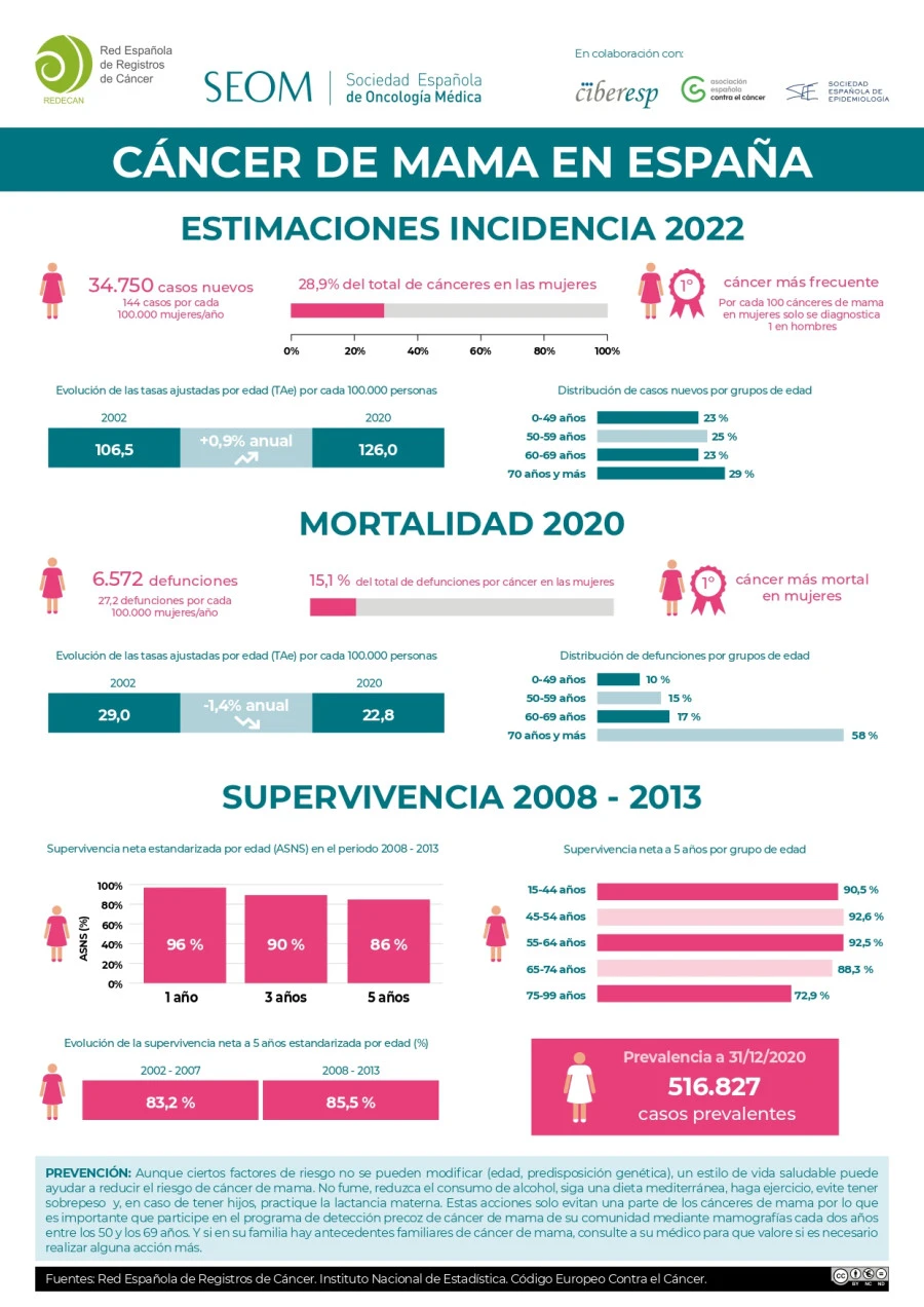 La incidencia de cáncer de mama en España está aumentando y se estima que en 2022 se diagnosticarán 34.750 nuevos casos, 144 casos por cada 100.000 mujeres/año. Entre 2002 y 2020, la tasa de incidencia anual ajustada por edad por cada 100.000 personas se incrementó de 106,5 a 126 casos. El cáncer de mama supone el 28,9% del total de cánceres en las mujeres y la primera causa de muerte por cáncer en España en ellas, según refleja la infografía sobre "Cáncer de mama en España" elaborada, coincidiendo con el Día Mundial del Cáncer de Mama, por la Red Española de Registros de Cáncer (REDECAN) y la Sociedad Española de Oncología Médica (SEOM).