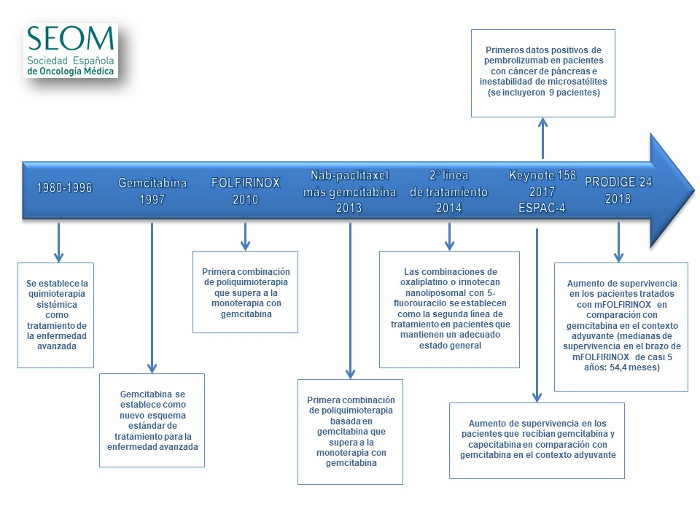 En los últimos años, varios hitos destacan en el manejo del cáncer de páncreas. Tras la publicación en 2010 del estudio PRODIGE4/ACCORD11 con FOLFIRINOX, que incrementaba la supervivencia y mejoraba la calidad de vida respecto a gemcitabina, y la publicación en 2013 del estudio MPACT, que también mejoraba la supervivencia, se han realizado varios estudios en el contexto adyuvante con estos nuevos esquemas que igualmente mejoran la supervivencia en los pacientes intervenidos de cáncer de páncreas. El estudio ESPAC-4, publicado en 2017, demostró un aumento de supervivencia en los pacientes que recibían gemcitabina y capecitabina en comparación con gemcitabina en adyuvancia, y el estudio PRODIGE 24, presentado en junio de 2018, también demostró un aumento de supervivencia en los pacientes que habían sido sometidos a cirugía radical, tratados con mFOLFIRINOX en comparación con gemcitabina. De hecho, en este estudio se alcanzaron medianas de supervivencia en el brazo de mFOLFIRINOX de casi 5 años (54,4 meses). Otros ensayos clínicos en el contexto adyuvante que comparan distintas estrategias presentarán resultados próximamente, como el estudio APACT, que compara gemcitabina-Abraxane versus gemcitabina, o el ensayo que comparará FOLFIRINOX versus Abraxane.