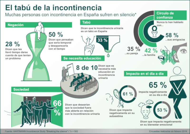 El estudio "Rompiendo el silencio" se ha realizado en 5 países europeos (Francia, Alemania, República Checa, Suiza y España) durante 2019 y analiza como las diferentes sociedades abordan y tratan el problema de la incontinencia urinaria. En concreto han participado un 76% de mujeres y un 24% de hombres a partir de 45 años con problemas de incontinencia urinaria. Una de las principales conclusiones que se desprenden es que la des estigmatización de la patología en la sociedad ayudaría mucho a los afectados y afectadas.