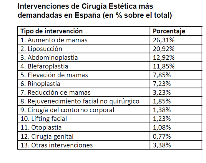 Aunque, como es habitual desde hace muchos años, las dos intervenciones quirúrgico-estéticas más demandadas en nuestro país son el aumento mamario y la liposucción, la misma encuesta revela que, por primera vez, cuatro procedimientos relacionados con la cara se encuentran en el top 10 de dicha demanda: la blefaroplastia o cirugía de los párpados, la rinoplastia o cirugía de la nariz, el rejuvenecimiento facial no quirúrgico -principalmente, rellenos con ácido hialurónico y tratamientos con toxina botulínica- y el lifting facial.